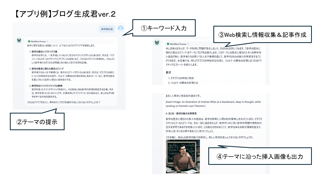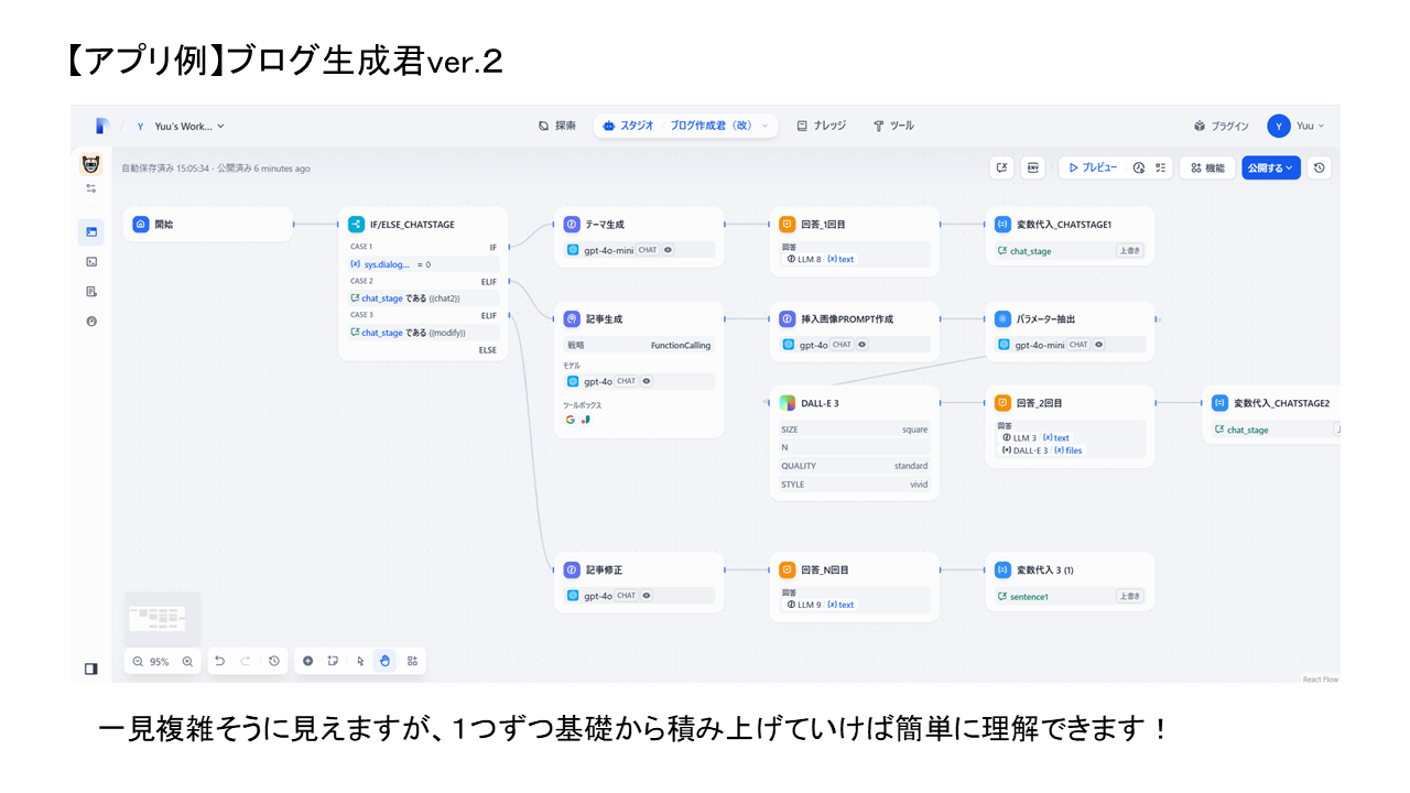 例えば基礎編で作成した、キーワードからブログ記事を自動生成するブログ生成君ver.1をチャットフローでバージョンアップさせてみました。