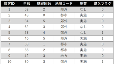 たとえば、次のような購買履歴データをもとに「年齢が高く、過去に複数回購入している人には効果が高かった」「一方、新規登録者には逆効果だった」といったように、施策の効き方を分ける条件やパターンを明らかにすることができます。
