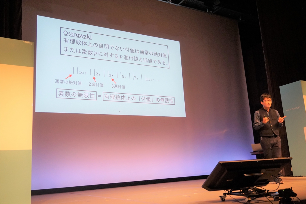 ゼータ関数を愛してやまない大阪大学の関先生が、人類の2つの勝利について熱く講演してくださいました。数学の面白さ、美しさを、「理解できなくてもいいんです、感じてください!」と関先生。