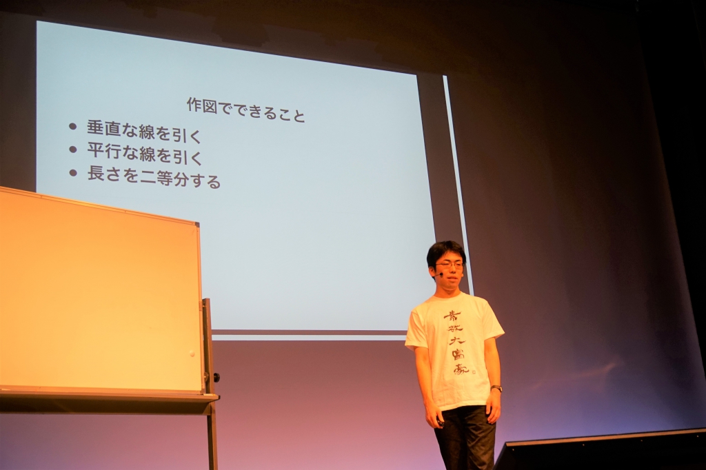 挑戦者3名がステージに登場。これから32時間で、正65537角形を定規とコンパスだけで描くという挑戦にトライします。その前に、いかにこのチャレンジが難しいかという説明がありました。複雑な計算を要するということですが、その計算を彼らの工夫によりエレガントに簡略化するとのこと。挑戦者は余裕の表情ですが、果たして……!