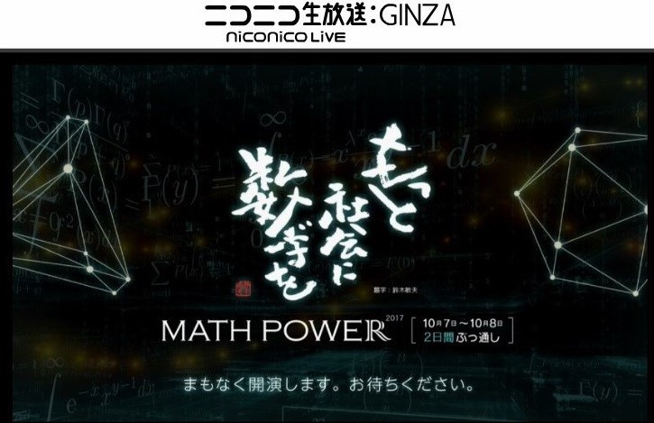 「MATH POWER 2017」は、「数学の楽しみ」や「数学と社会の関わり」とは何かを一緒に考えようという意図で企画されたイベントです。主催するのは、株式会社ドワンゴが運営するエンジニア業界発展のための出版ブランド「アスキードワンゴ」さん、新宿で数学・統計教室を展開する「株式会社すうがくぶんか」さん、そして和から株式会社の3社です。10月7日正午から翌8日20時まで、夜通しの32時間ぶち抜きで、数学で有名な著名人、大学教授らによる講演や、32時間耐久のチャレンジ企画、お笑い企画など様々なコンテンツをお届けしました。