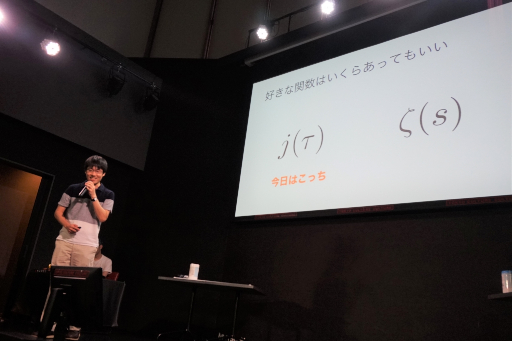 トップバッターを飾るのは「The ロマンティスト!」日曜数学者のtsujimotterさんです。「触れる」、「食べれる」ゼータ関数でお馴染みですが本日紹介するのはj関数です。高校生でも計算できるような数が「ほとんど整数」になる背景を、虚数乗法、保形関数など高度な数学を駆使して説明しました!