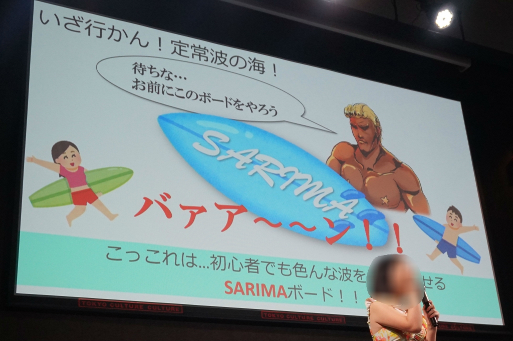 普段はお堅い仕事をしているきなこさんが、ロマ数史上初の水着姿!で時系列解析の分析法SARIMAモデルを紹介しました。水着姿でスライドの中の波乗りジョニーと一緒にSARIMAモデルを紹介するあたり、一見ふざけたように見えますが、実際はスライドに数式があふれる、がっちりしたバリバリの数学プレゼンだったんです。そのギャップに会場がざわつきました。目のやり場に困るものの、印象が強いプレゼンだったので、もうSARIMAモデルが頭から離れません!