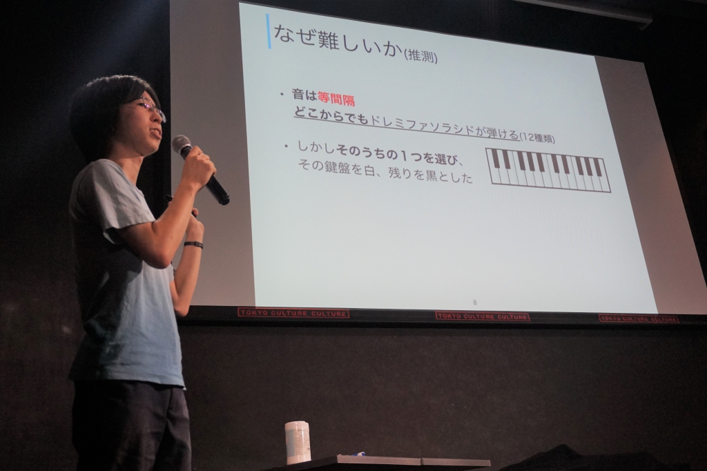大学院で数学を専攻しているカナンさんはピアノも趣味とのことで音楽と数学をテーマにプレゼンをしました。身の回りには一見数学では解けないような、数学とは関係の無いような問題が溢れているわけですが、それらの問題を正しく数学の言葉で翻訳すれば、数学の力で問題を解くことができます。カナンさんは「音名」、「スケール」、「音程」、「コード」といった音楽の用語を数学の言葉に翻訳し、音楽の世界で知られていた事実の証明まで完了させてしまいました。つまり定理が生まれました!強力な数学の力を使う事で、音楽の世界に新たな知見が生まれるかも!?