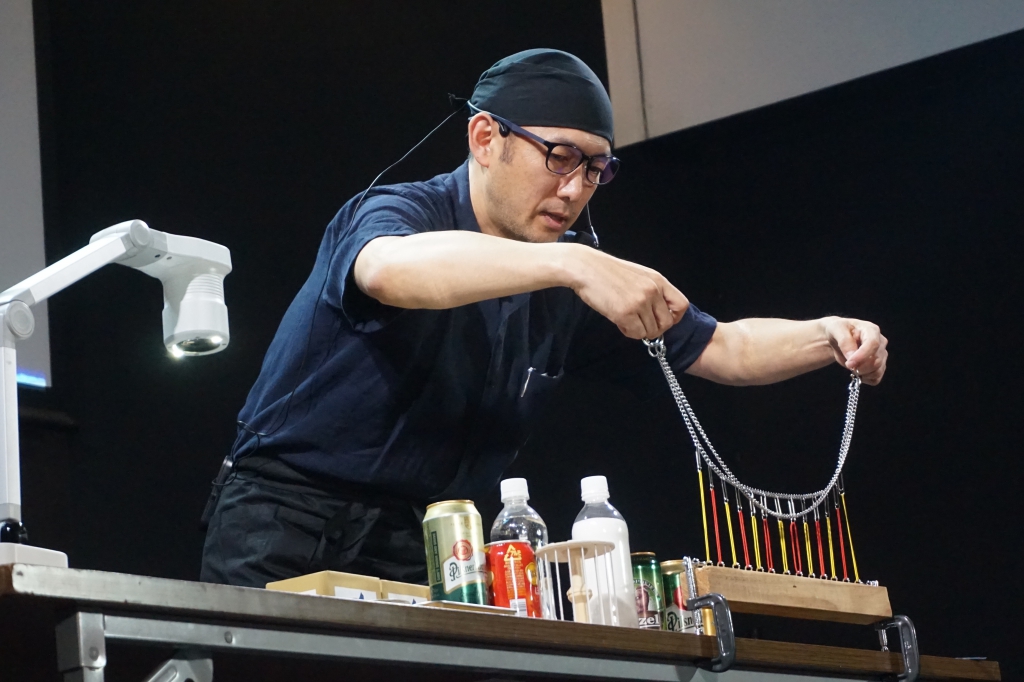 大トリは明治大学の矢崎先生による実験数学です。矢崎先生の衣装はさながら和食の料理家のようでした。そのプレゼンは塩、水、パスタ等々料理で使うような素材、器具が次々に出てきて、数学のプレゼンというより、料理番組を見ている気分にさせるものでした。全体の実験を通して「2乗」というテーマが設定されており、中学高校から慣れ親しんだ「2乗」を紙の上だけではなく実際に感じることができるという事に驚きました。