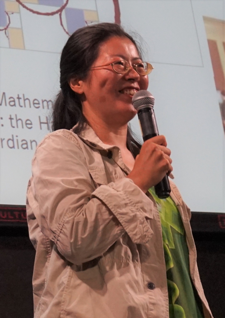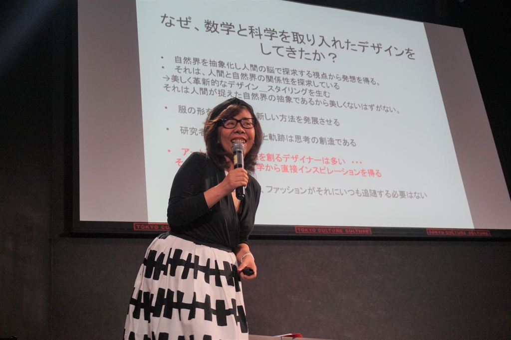 前半のトリを飾るのは世界的なウェディングドレスデザイナーのエマ理永さんです。エマ理永さんは10代の時にファッション、デザインを学びましたが、当時は感性が全てと言われており、数学の時間は寝ていてよい、と言われていたそうです。。。そんなエマ理永さんが理数の考え方に出会ったのはなんと40歳を過ぎてから。フラクタル、トポロジー、カオス、対数螺旋など数理の考えをデザインに取り入れることで、これまでになかった美しいドレスを生み出してきました。エマ理永さんの柔らかい口調のプレゼンと、美しいドレスの映像で会場にうっとりした空気が流れました!
