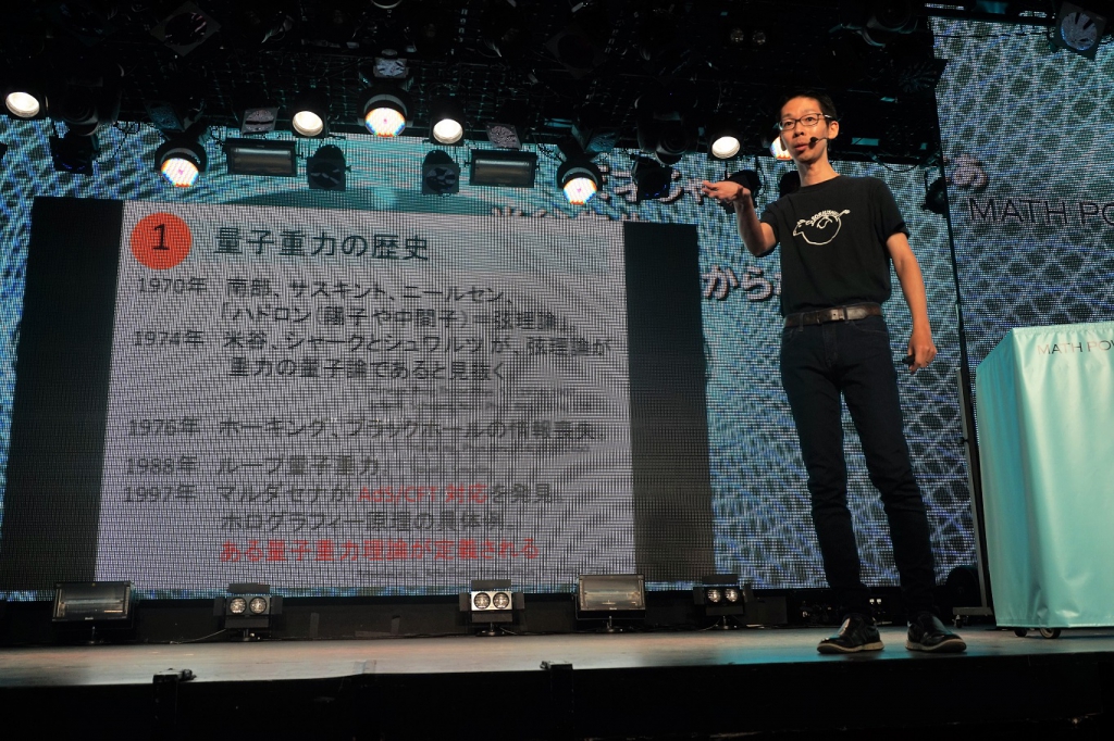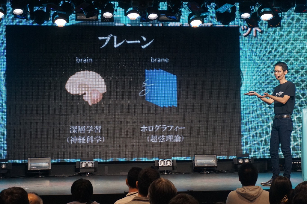 大阪大学の橋本幸士先生は最近話題の深層学習(ディープラーニング)と物理学の関連についてご講演してくださいました。橋本先生は物理学者ということで、数学者と物理学者の違いを小ネタとして講演の随所随所で語り笑いを誘いました。物理学者は量子力学と重力を統一する量子重力理論の完成を目指しており、その一つの解決策としてホログラフィー原理というものが提案されています。ホログラフィー原理を前提として、どういう量子状態なら今の宇宙が再現されるのか、その解決に深層学習が有効だそうで、研究が進んでいます。