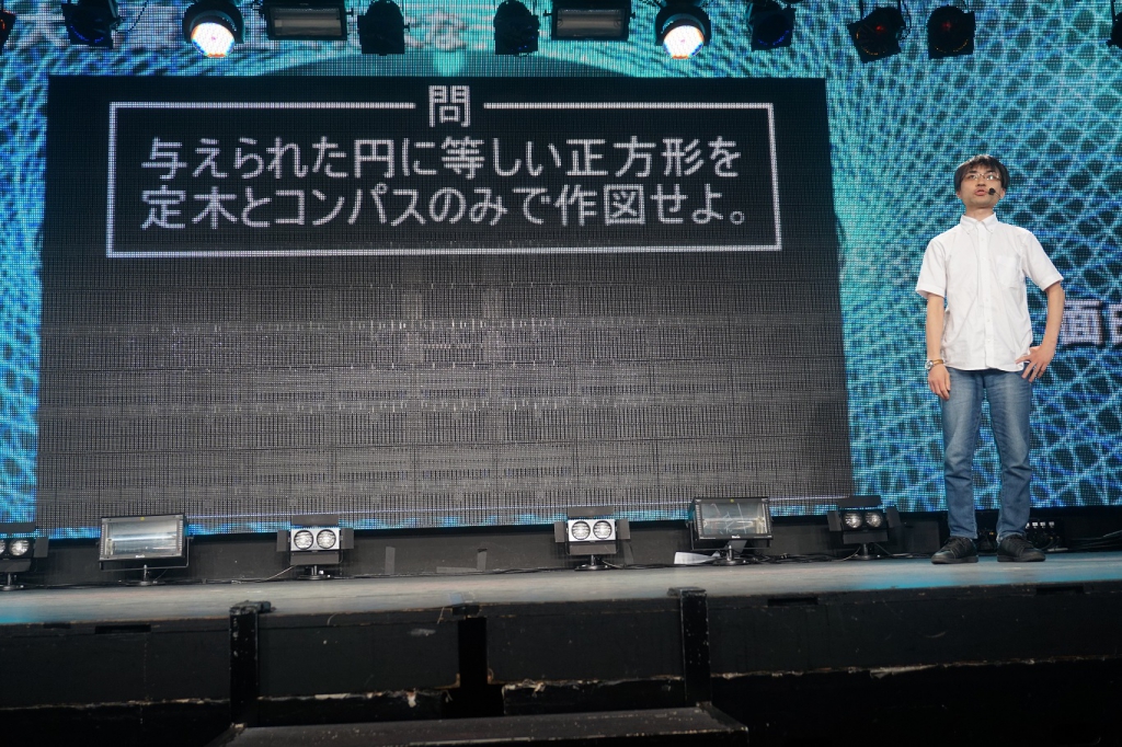 ↑トップバッターは現役高校生で受験生の電たくTさんです。「二次方程式は解を二つしか持たない」といった、高校数学の教科書に書かれている嘘を発見し披露しました。