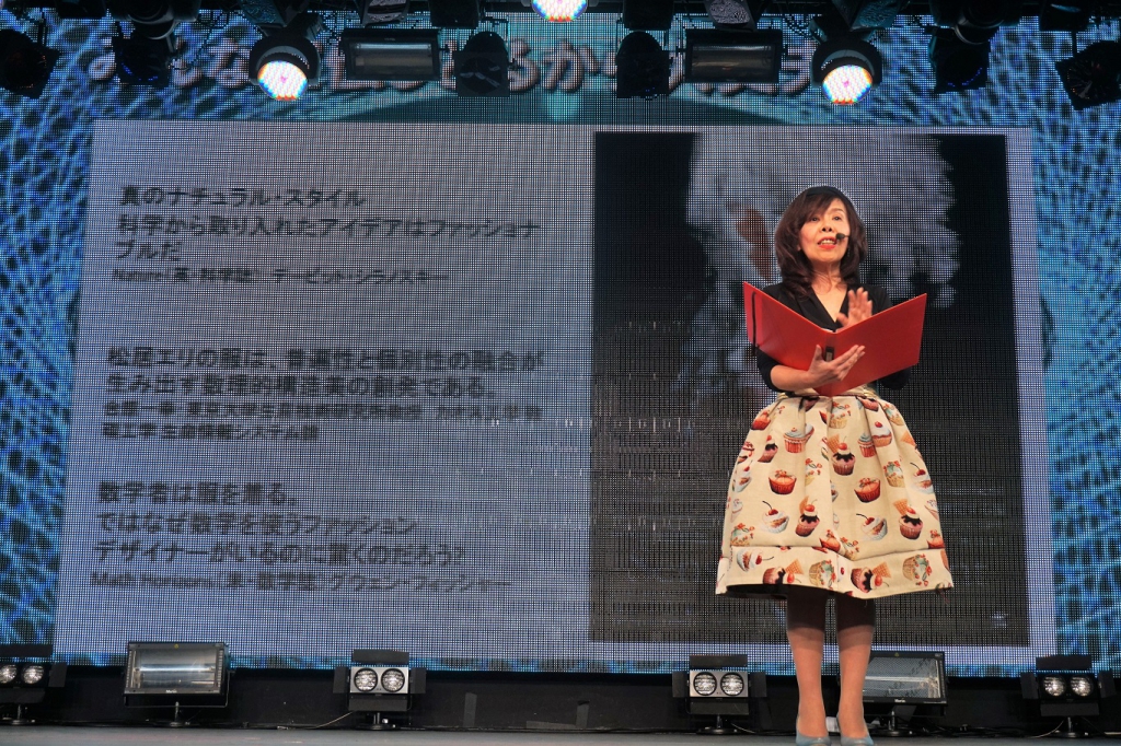 ↑大トリのエマ理永さんは世界的なファッションデザイナーで、数理の考えをデザインに応用して素敵なドレスを生み出し続けています。エマ理永さんの独特の語り口に会場と、コメント欄がうっとり酔いしれていました。
