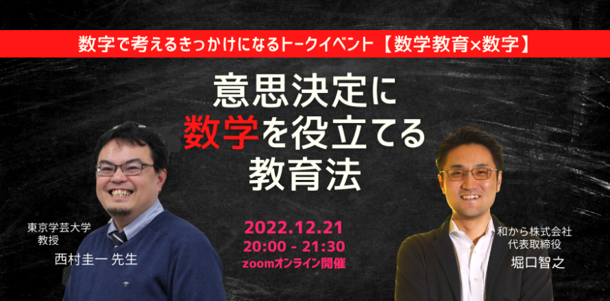 今回は、日本の数学教育と長く向き合ってこられた西村圭一先生だからこそわかる、数学教育の裏話を対談形式でお話していただこうというトークイベントです。「新たな数学の見方を学ぶ」が今回のテーマです。