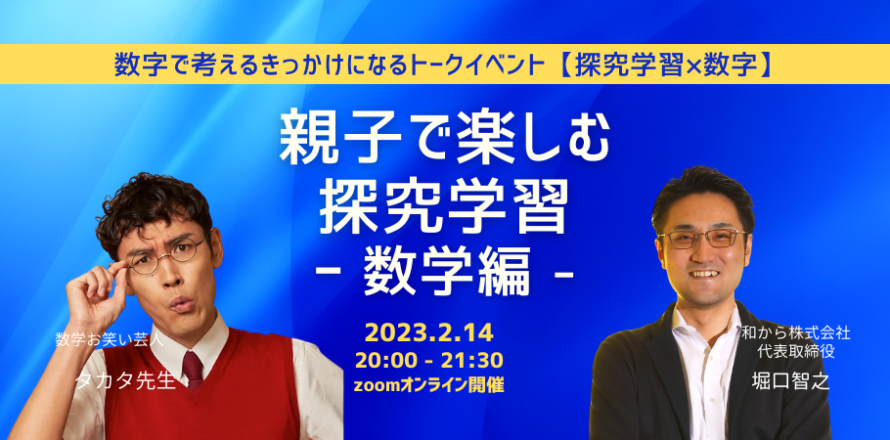 今回のテーマは、「親子で楽しむ探究学習-数学編-」です。特に、数学という分野は親子で最も楽しみにくい分野の一つ。だからこそ、特別ゲストとして算数や中学数学とずっと向き合ってきた数学系お笑い芸人でもありyoutuberとしても活躍されているタカタ先生をお呼びし、親子で楽しむ探究学習を深めていきます。