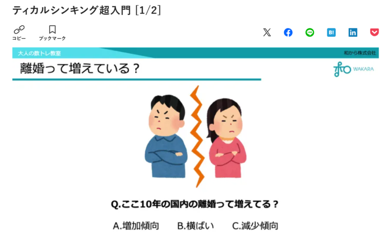 掲載記事では、凶悪犯罪の件数の推移や離婚の変化から見るクリティカルシンキングの重要性、ビジネスの現場で求められる思考の質を高めるための基本的なフレームワーク・考え方について、セミナーでの解説内容をもとに