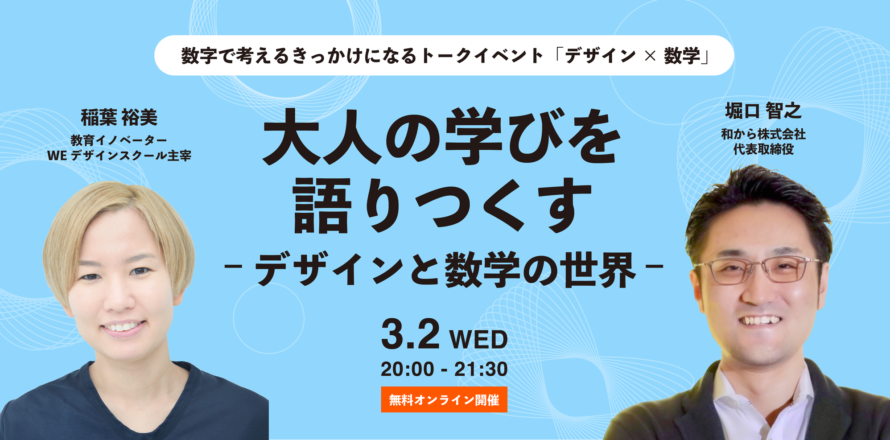 今回、日本初のビジネスパーソンのデザイン学校「WEデザインスクール」主宰である稲葉 裕美さんが話し手、大人のための数学教室の創業者であり数字に強くなる数トレ教室代表の堀口智之が聞き手になって様々な角度から対談していきます。