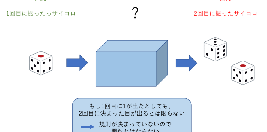 このとき、1回目に出た目と2回目に出た目には全く規則性がなく、何回もサイコロを振ると入力された目の数は同じなのに出力される目の数が違うといったことが起きてしまい、関数ではなくなってしまいます。そのためこれは関数とは見なせないわけです。