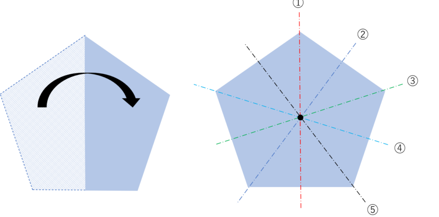 また、この五角形の他の対称軸を探すと、合計で\(5\)つの対称軸が取れます。