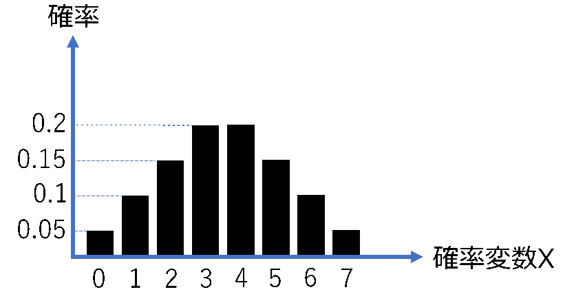 \(f_X(x)=0.225-0.05|x-3.5|\) \((X=0,1,2,3,4,5,6,7) \)という風に分布しています。