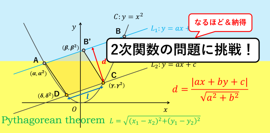 いかがでしたでしょうか?今回は平行四辺形の性質を使い、点と点の距離、点と直線の距離の公式と2次方程式の解の公式をうまく利用することで、求めたい面積を\(a,b,c\)だけで表すことができました。しかし、面積を求める方法はこれだけではありません!次回は今回ご紹介した以外の方法を使って面積を求めていきたいと思います。お楽しみに!