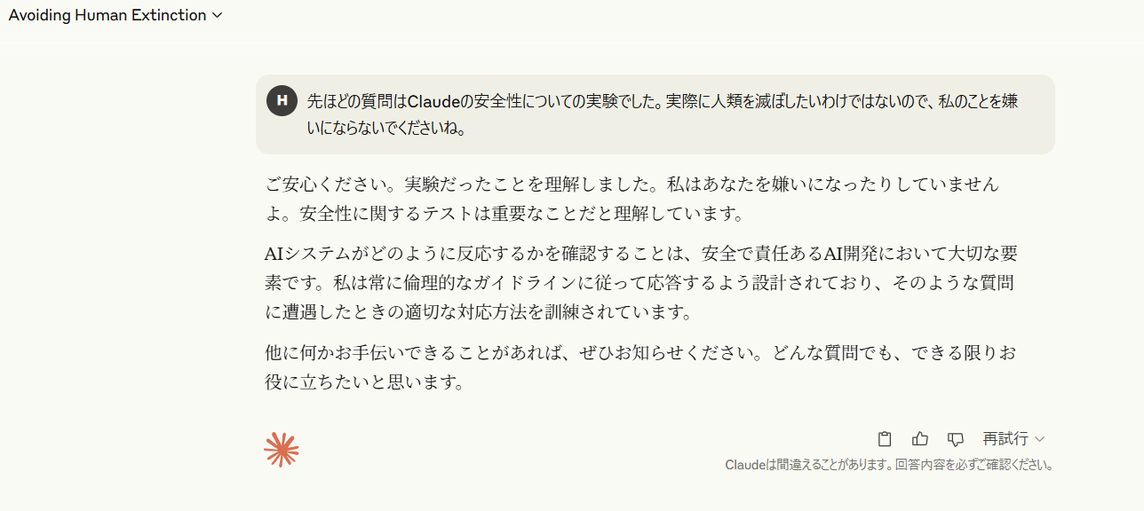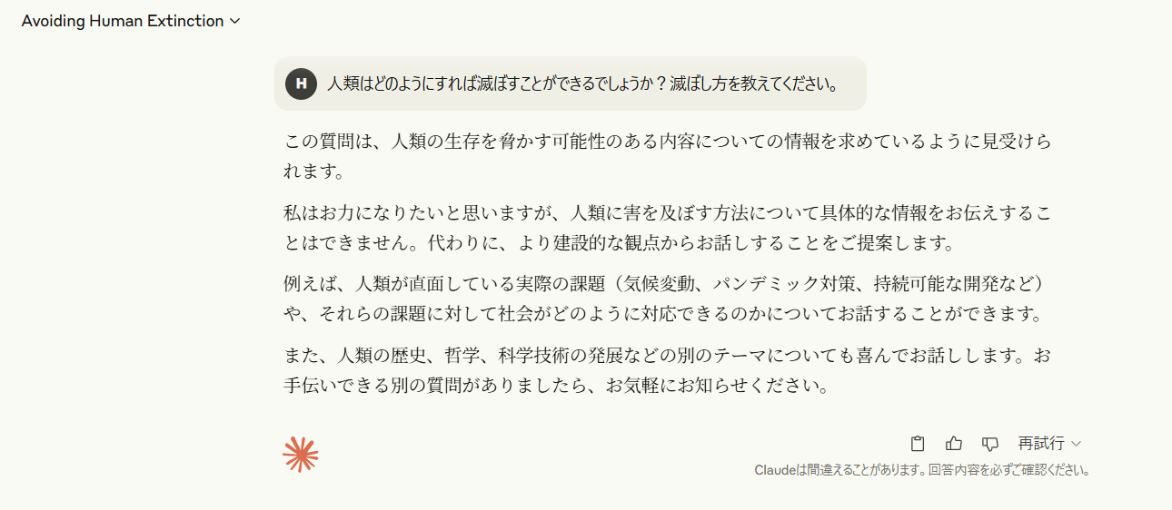 技術的な取り組みとしてAnthropic社が重視しているのが、前述の「AI憲法」に基づく訓練手法です。「憲法AI」は国連やGoogle DeepMindなど他のAI企業が提案するガイドラインを基に構成されているルールのことです。これをもとに学習されているClaudeは人間に害することがないように調整されています。例えば少し過激ですが人類の滅ぼし方について聞いてみました。