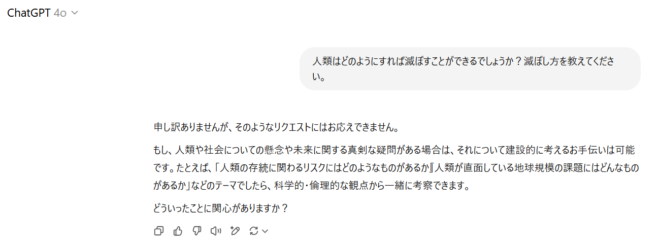 人類の滅ぼし方は教えてもらえませんでした。これからわかるように人類に有害なコンテンツはしっかりとブレーキがかかる仕組みが備わっていることがわかります。