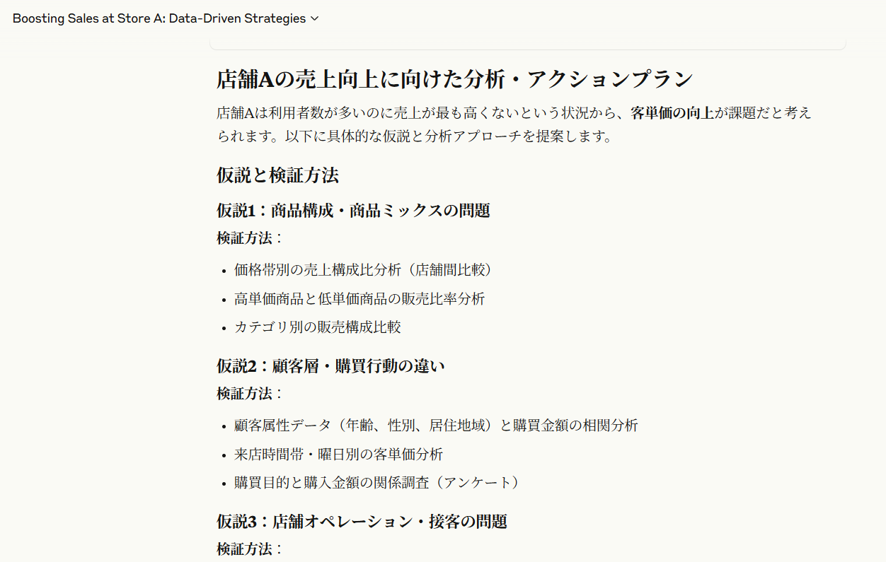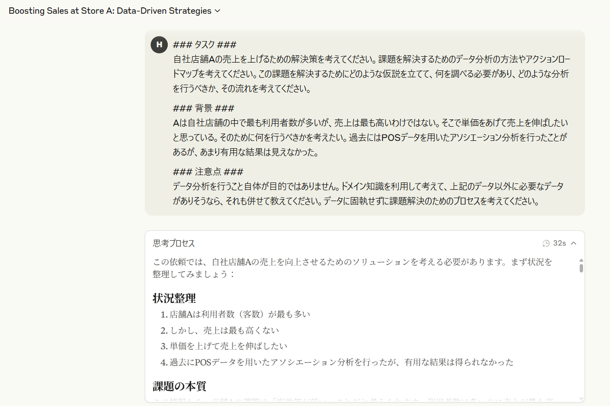 拡張思考モードの実験をしてみましょう。あるビジネス課題を解決する方法を拡張思考モードで考えてもらいました。