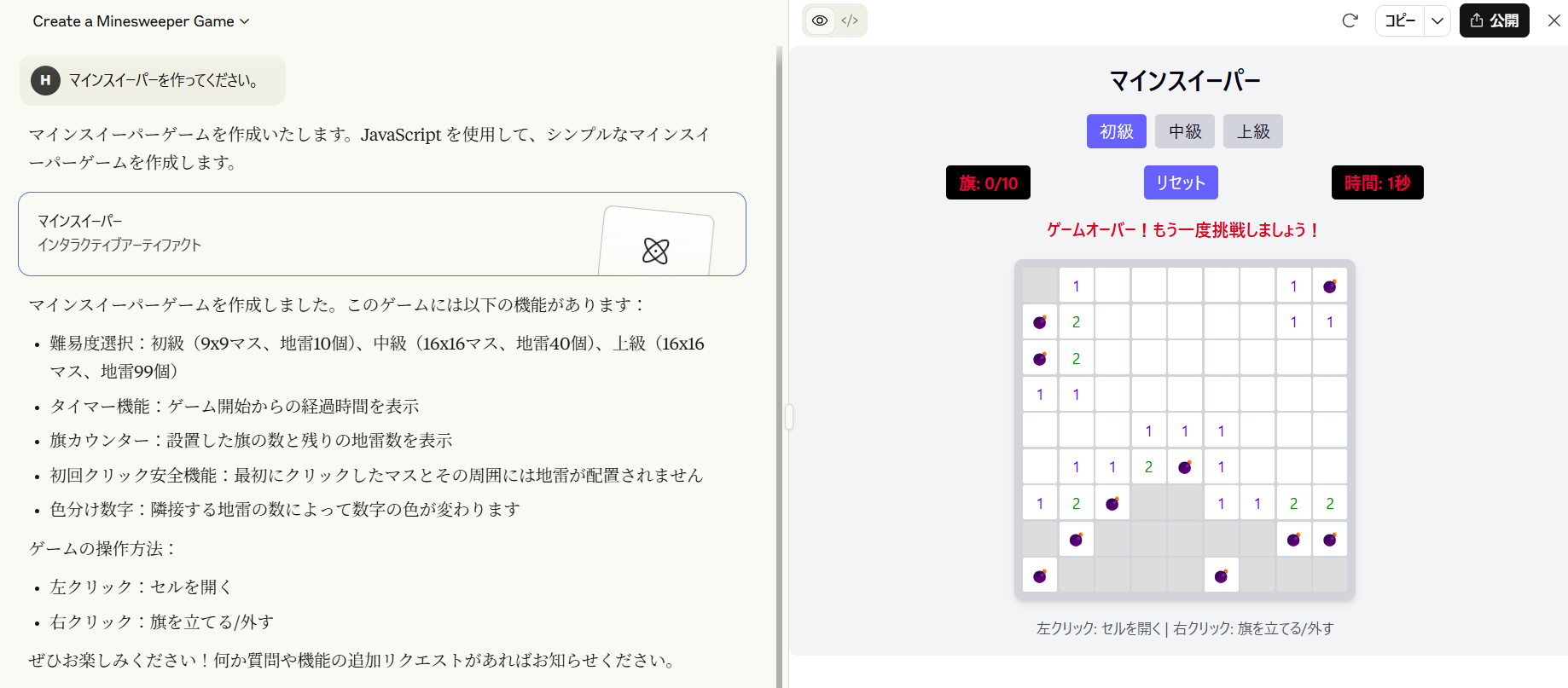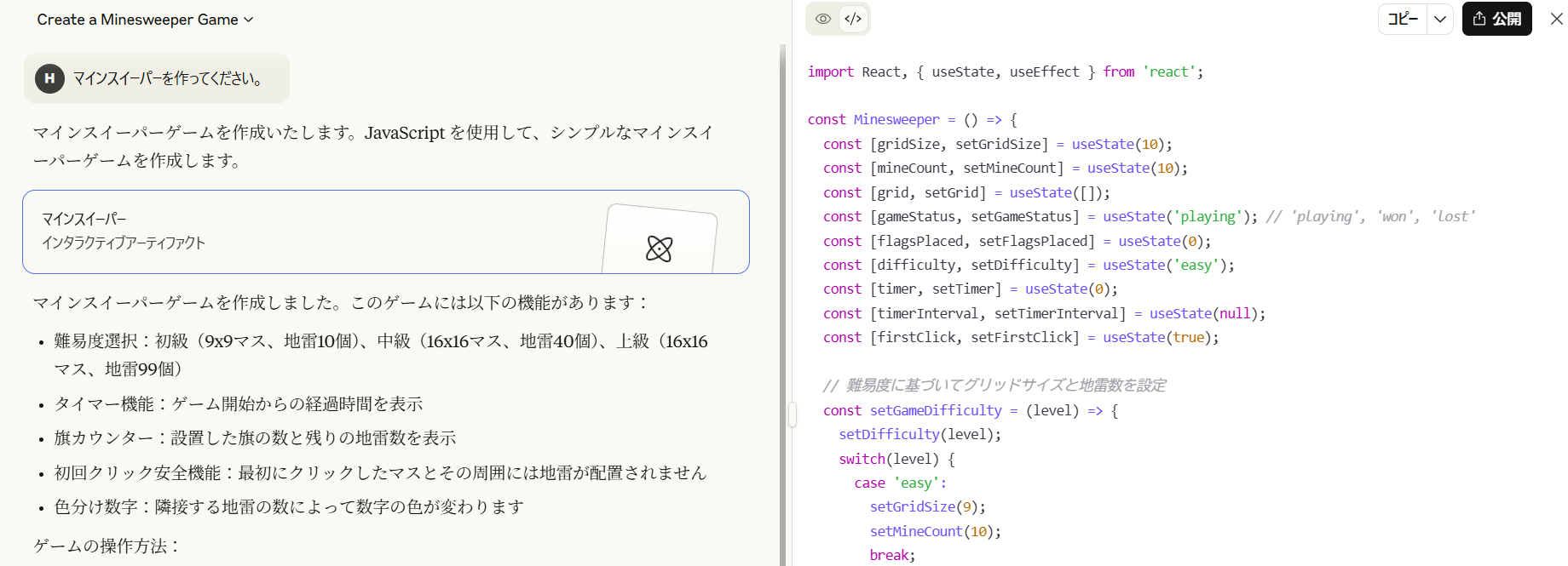 ClaudeにはArtifacts機能が搭載されています。Artifacts機能とはユーザーがAIとやり取りしながら図表やアプリなどのコンテンツを作成することができる機能です。この機能によりClaudeはユーザーと対話するAIという位置づけから、コンテンツ生成を行うアシスタントに進化を遂げたと言えるでしょう。例えば以下の図のように、「マインスイーパーを作ってください。」とお願いすれば、画面の右半分でコードを作成してくれます。