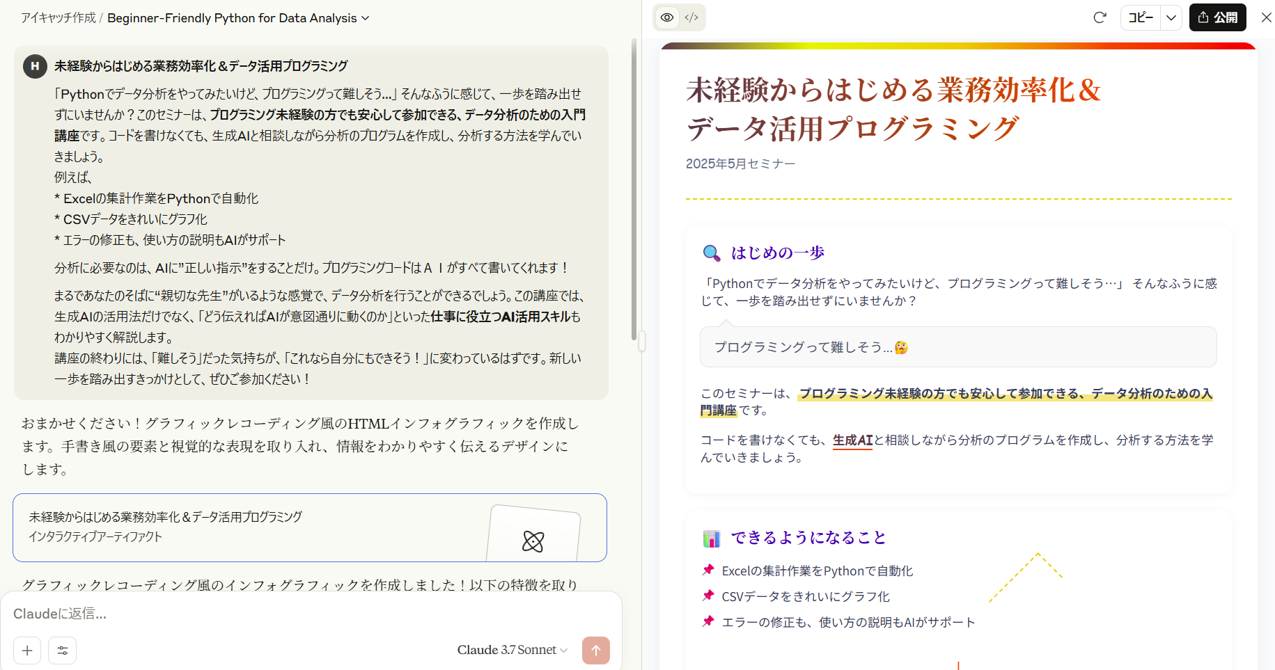 作成できるのはアプリだけではありません。例えば文章やpdfなどのコンテンツをHTML形式のインフォグラフィックに変換する、なんてこともできます。ここでは実験的に弊社のセミナー情報をインフォグラフィックにしてみました。