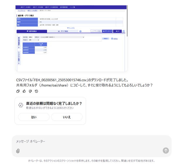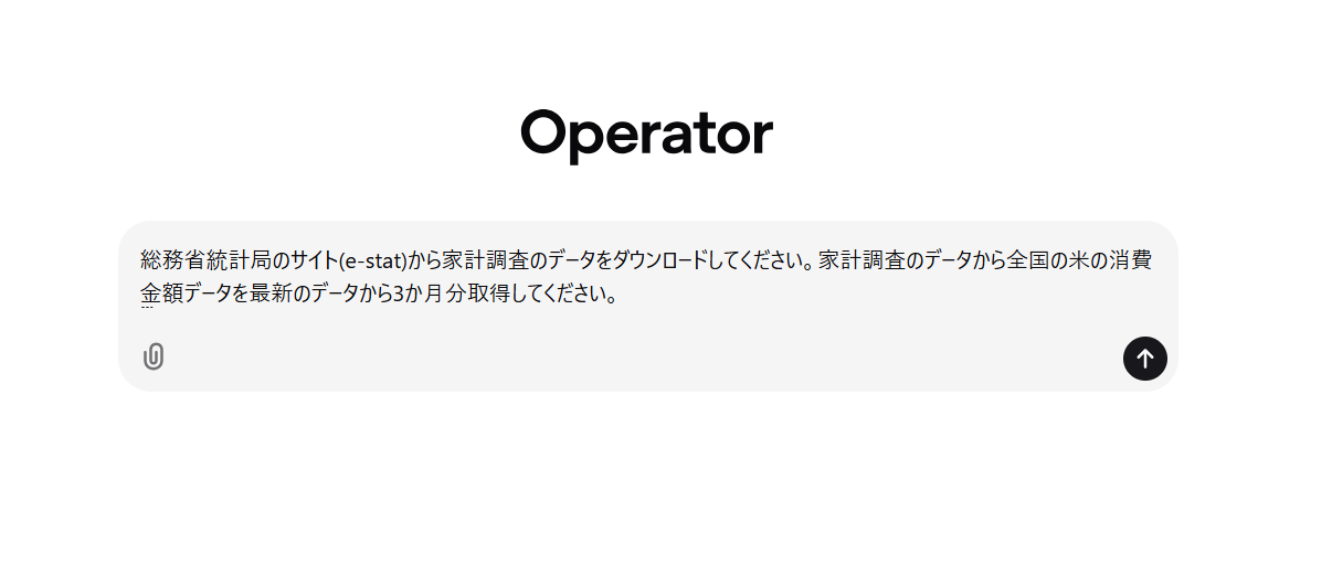 1つ目はデータの取得です。私はよくwebからデータをダウンロードし分析に使っています。いつも必要なデータを手動で探し回っているのですが、この操作をOperatorができるかどうかを行ってみます。今回は統計局のe-statというサイトから指定したデータを取得する指令を与えてみました。