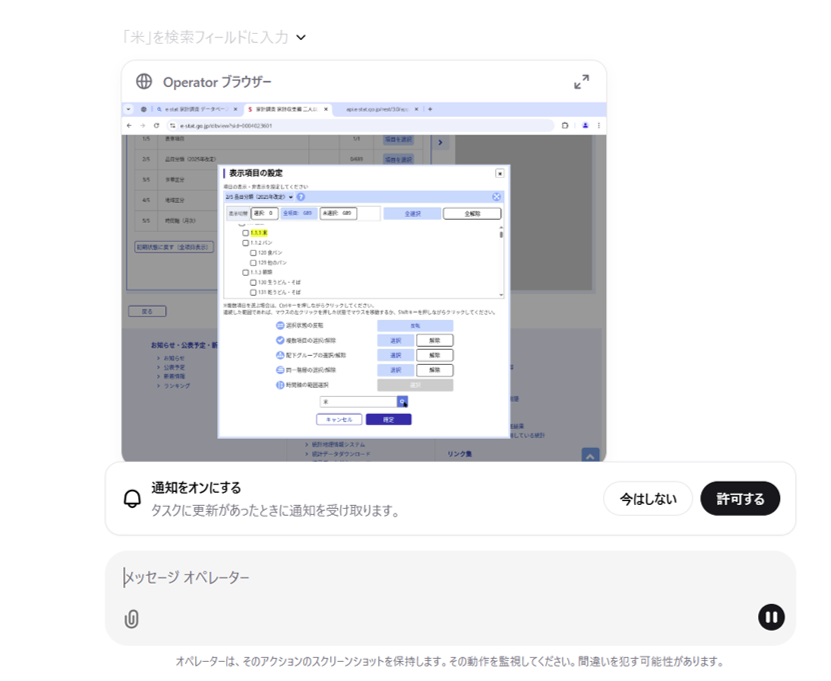 このように指令を与えてあとは待つだけです。Operatorがブラウザの操作を行っている場面はリアルタイムで見ることができます。