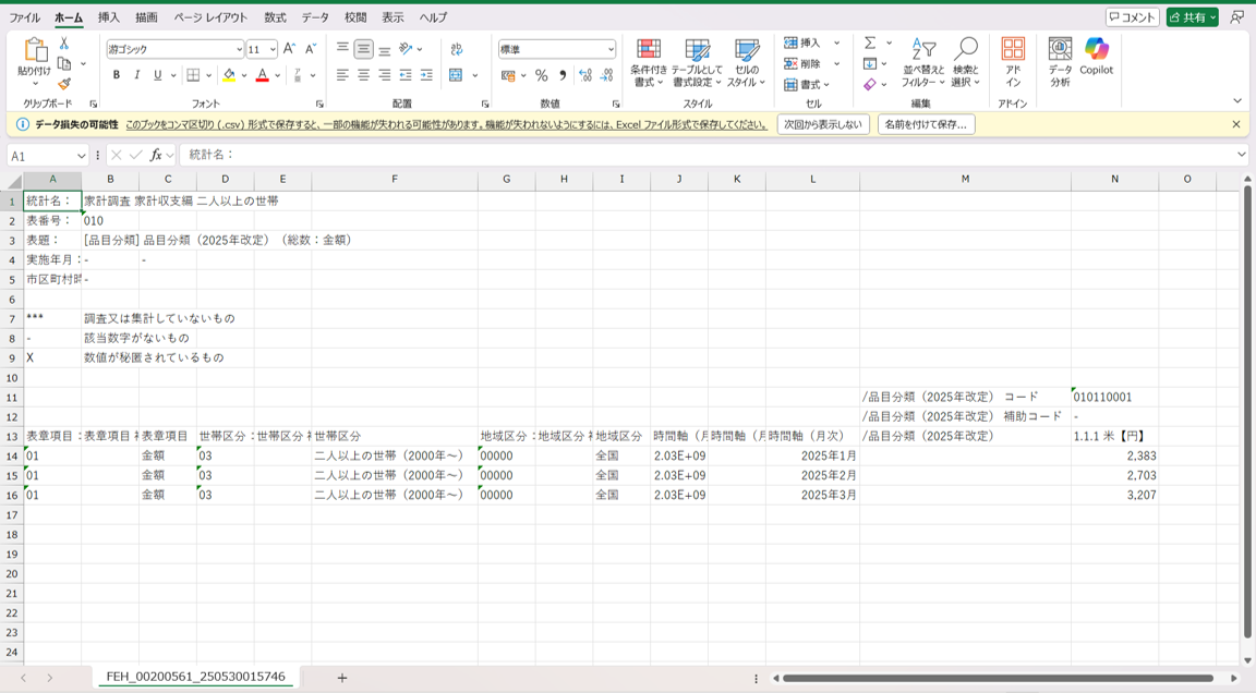 正しく指定したデータをCSVでダウンロードすることができました。正直、e-stat-内にはたくさんのデータがあり、家計調査のデータもかなりの項目があるので、指定したデータをピンポイントで取得するのは難しいのではないかと思っていましたが、そこはさすがのo3モデルです。問題なくデータの取得を行うことができました。