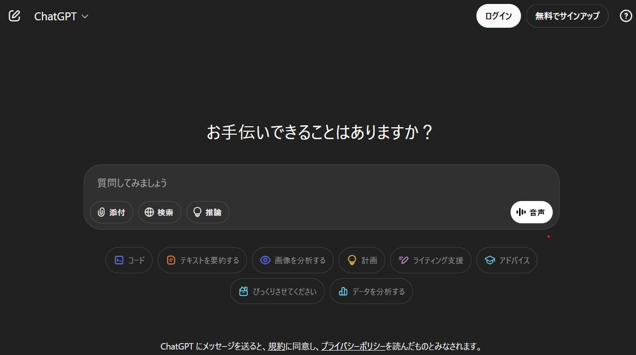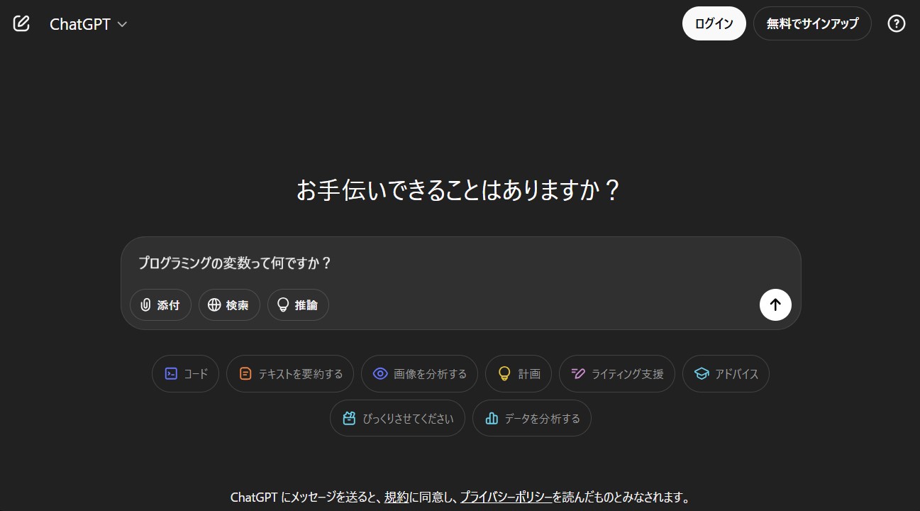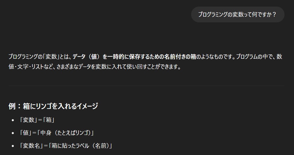 中心の入力欄に、例えば『プログラミングの変数って何ですか?』と聞いてみましょう。