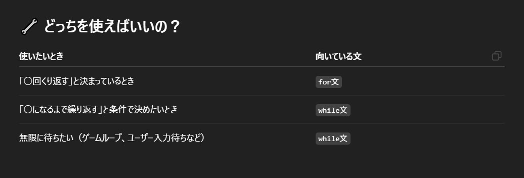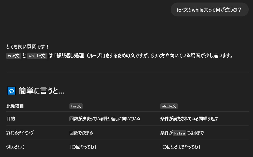 繰り返し処理の代表であるfor文とwhile文の違いもChatGPTに聞いてみましょう。こうした比較の質問にも、ChatGPTはポイントを押さえて答えてくれます。