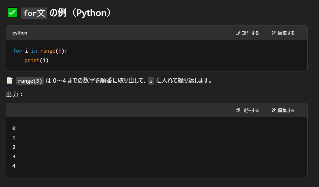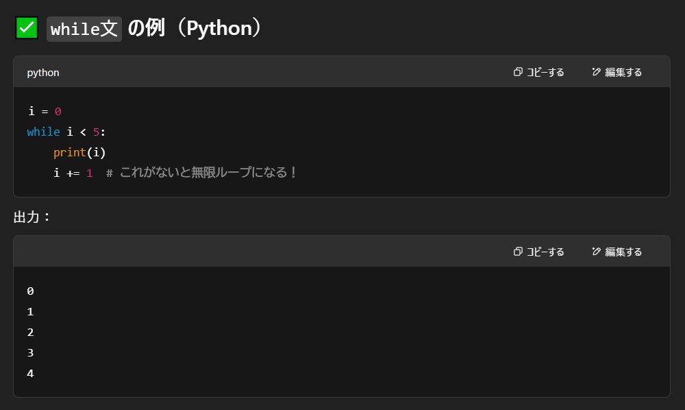 こうした説明を読むと、生成されたプログラムを見比べながら「決まった回数繰り返したいときはfor文、そうでないときはwhile文を使うんだな」と納得できますよね。もちろん、このプログラムもColabですぐ試せます。ChatGPTの解説を確認し、実行してみることで、繰り返し処理の違いが体感的に理解できるはずです。