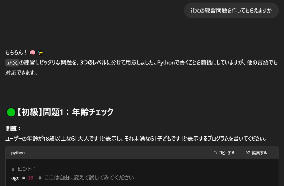ChatGPTは解説するだけでなく、練習問題を作ってくれる先生にもなります。たとえば「if文の練習問題を出して」とお願いしてみると、ChatGPTは即座に問題を考えて提示してくれます。
