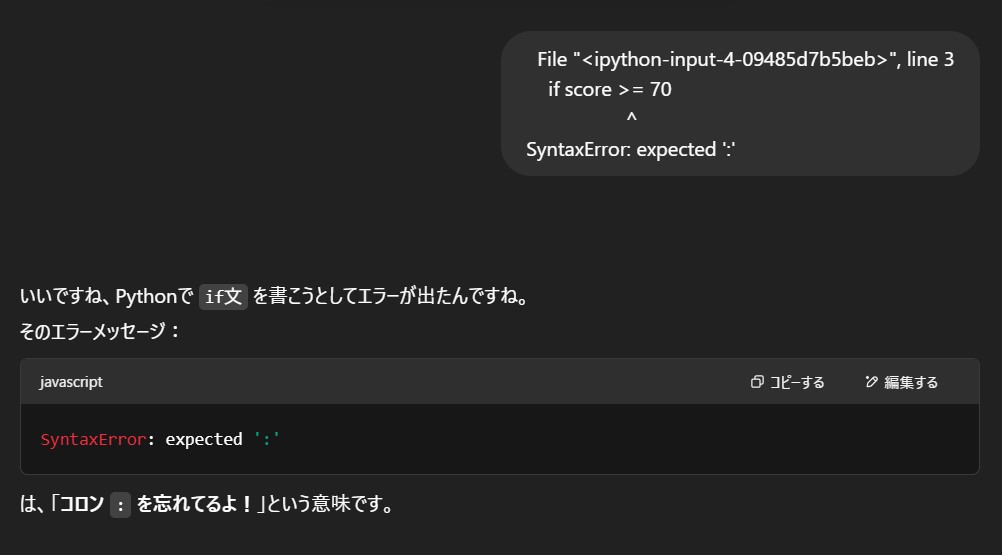 実際にコードを書いていると、エラーに遭遇することもありますよね。そんなときも慌てなくて大丈夫。エラーメッセージすらChatGPTは教師役として活用できます。 もしプログラムを実行してエラーが出たら、その赤字のエラーメッセージをコピーしてChatGPTに質問してみてください。「このエラーの原因を教えて」と聞けば、どこに問題があるかを指摘し、修正方法までアドバイスしてくれます。