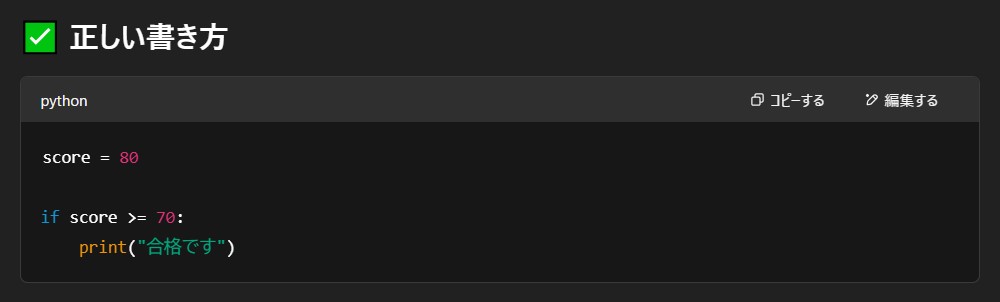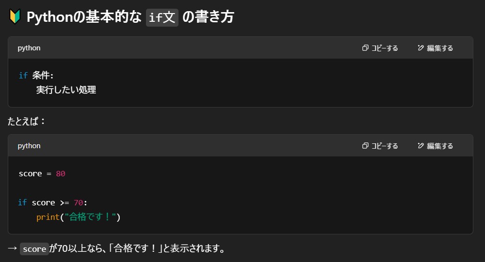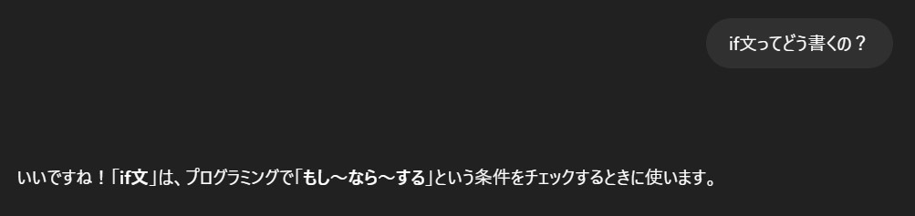 また、「もし条件を満たさなかった場合はどうなるの?」と疑問に思ったら、その場でChatGPTに追加で質問できます。例えば「ifとセットで使うelse文は?」「条件が複数ある場合は?」などと聞けば、ChatGPTはelse文やelifの使い方まで続けて教えてくれるでしょう。