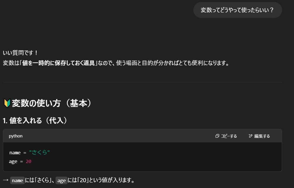 ChatGPTにこう質問すると、次のようにPythonでの変数の使い方を基本から教えてくれます。