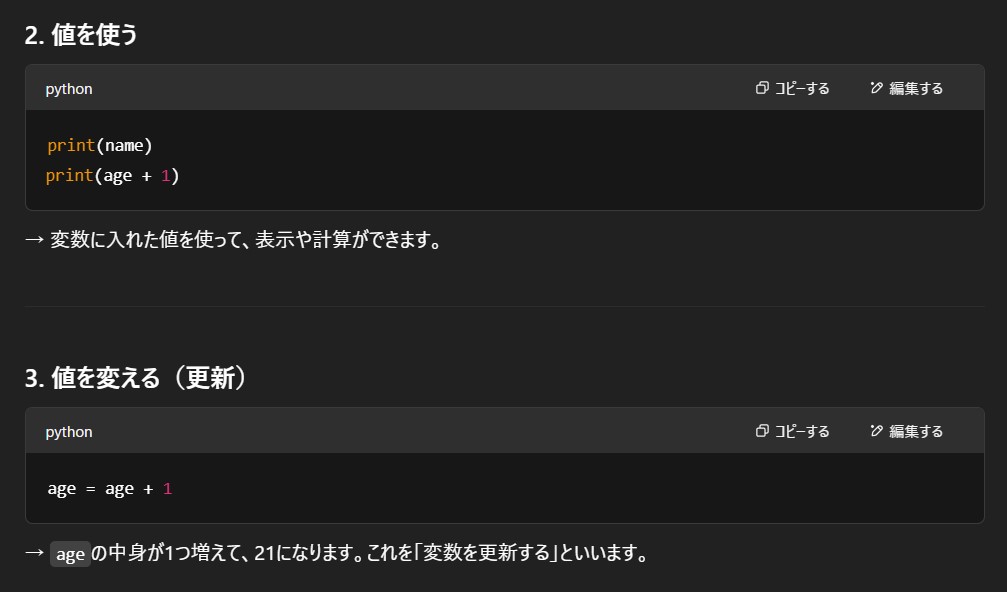 すると、次のように回答してくれます。分かりやすく説明してくれるだけでなく、変数を使う意味や実際の使い方など、短い指示から様々な切り口の説明をしてくれます。