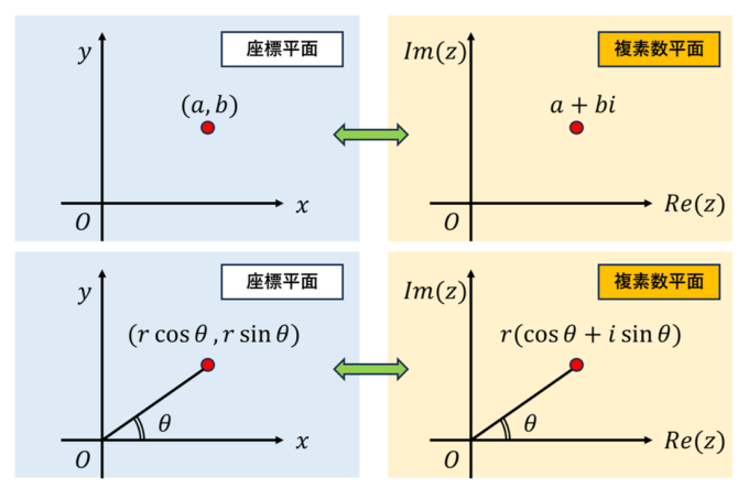 平面上の点を極座標で表すと、原点から角度 \(\theta\)、距離 \(r\) の位置にある点は \((r\cos \theta, r\sin \theta)\) であり、複素数では