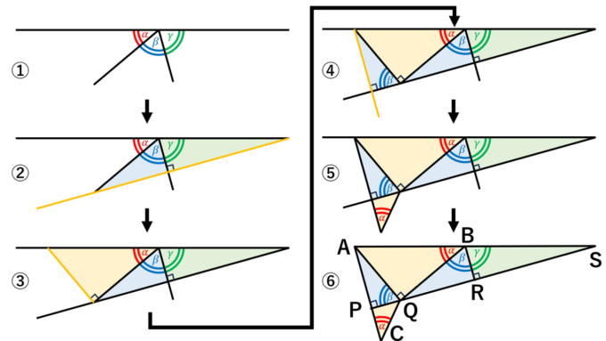 まず、3つの角度 \(\alpha, \beta, \gamma\) の和が \(\pi\) となるような状況を図形で表現します。以下の【図1】のように、順番に①から⑥までのステップで直角三角形を組み合わせて構成していきます。