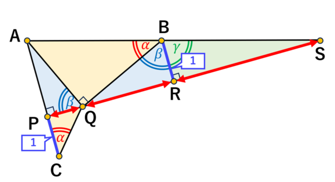 この図形から、三角形ABQと三角形QCPが相似、また三角形BQRと三角形QAPも相似であることがわかります。これらの相似関係を利用すると、辺BRとPCの長さが等しくなることが示され、これを 1 と設定しておきます。