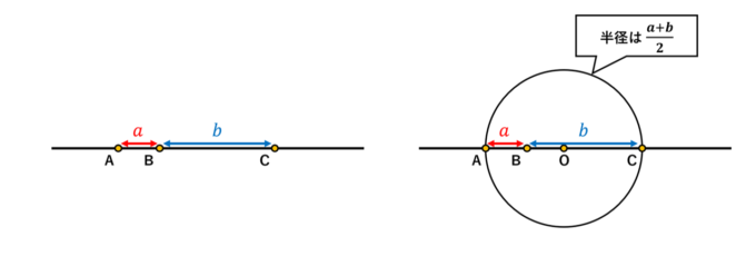 続いて、図を用いた \(n=2\) の場合の証明をご紹介しましょう。次の図のように、直線上に点 \(A,B,C\) をとり、\(AB=a, BC=b\)(ここでは \(a < b\) としておきましょう)とします。また、\(AC=a+b\) を直径にもつ円を考え、円の中心点を \(O\) としておきます。