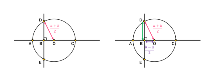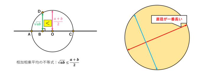 となります。図から明らかなように \(BD\) は半径より小さいので、相加相乗平均の不等式 \( \sqrt{ab} < \frac{a+b}{2} \) が成り立つことがわかります。