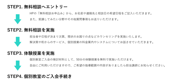 【STEP2.無料相談】担当者と日程が決まれば、個別教室事務局から確認メールが届きます。お手数ですが一度ご返信いただき、日程確定となります。無料相談では、現在お困りの点や学習でお悩みの点などどんな内容でも構いませんのでお気軽にお問合せください。また、和からのシステムや個別授業の料金説明をさせていただきます。