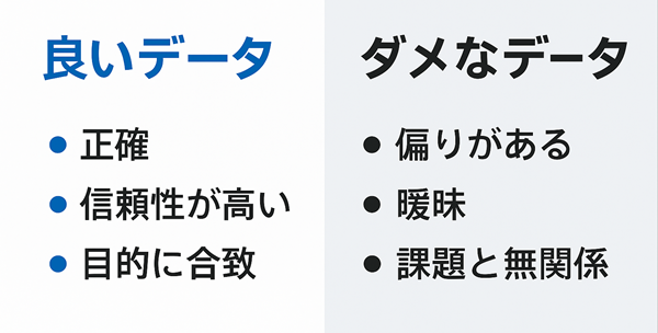 ダメなデータ:偏りが強い、測定方法が不明、課題と関係が薄い