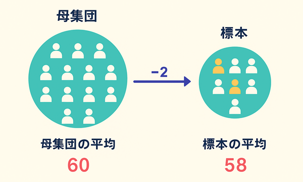 サンプリング誤差とは、調査で集めた一部の人のデータ(標本)から計算した結果が、本当の全体の数字(母集団)と少しズレてしまうことです。難しい言葉に聞こえますが、簡単に言えば「たまたま選んだ人の違いによるズレ」です。