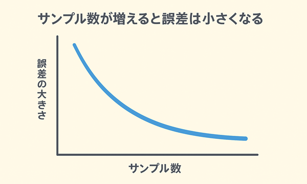 調べる人数(サンプル数)が多いほど、結果は安定し、誤差は小さくなります。逆に人数が少ないと、1人の答えで大きく結果が変わってしまいます。