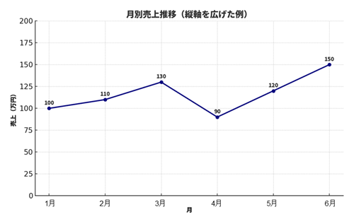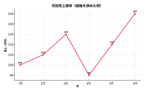 同じデータでも、縦軸の幅を狭めると変化が激しく見え、広げると穏やかに見えます。株価チャートなどで強調のためによく使われる手法です。「上がってる!」と思っても、スケールを確認すると実際は微増…なんてこともあります。