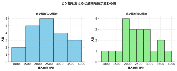 区切り(ビン幅)を粗くすると“どこが最多か”が変わることがあります。目的に合わせた幅設定が大切。