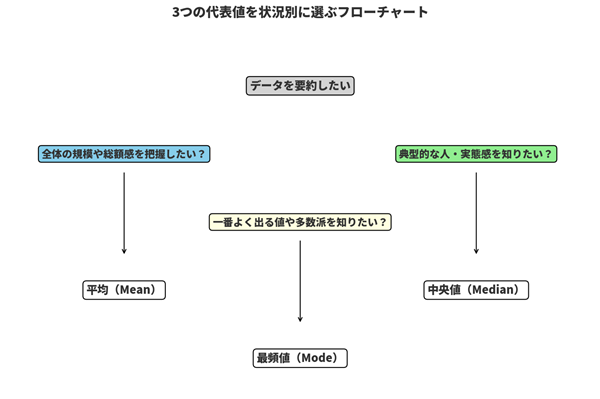 平均は“ならし”、中央値は“真ん中”、最頻値は“よく出る”。同じデータでも、見る指標が違うと結論が変わります。実務では 「最頻値=顧客の選好」「中央値=現場の実感」「平均=経営の総額感」 と捉えると使い分けがスムーズです。迷ったら3つを並べてみる——それだけで意思決定の質が一段上がります。