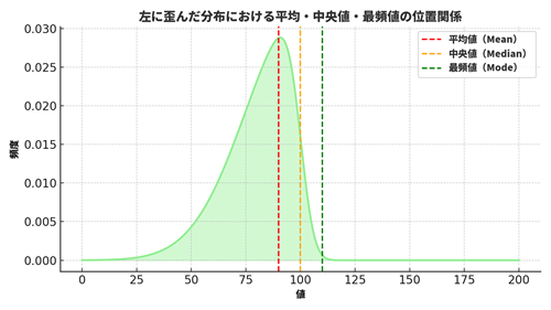 平均が実際よりも低く見えやすく、データの“下方向の偏り”が見えてきます。